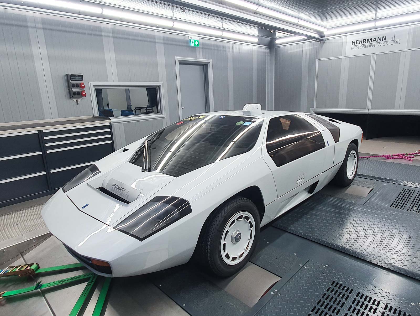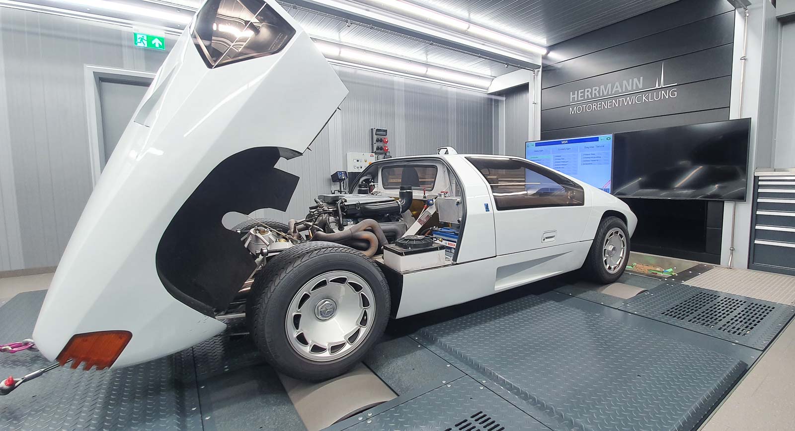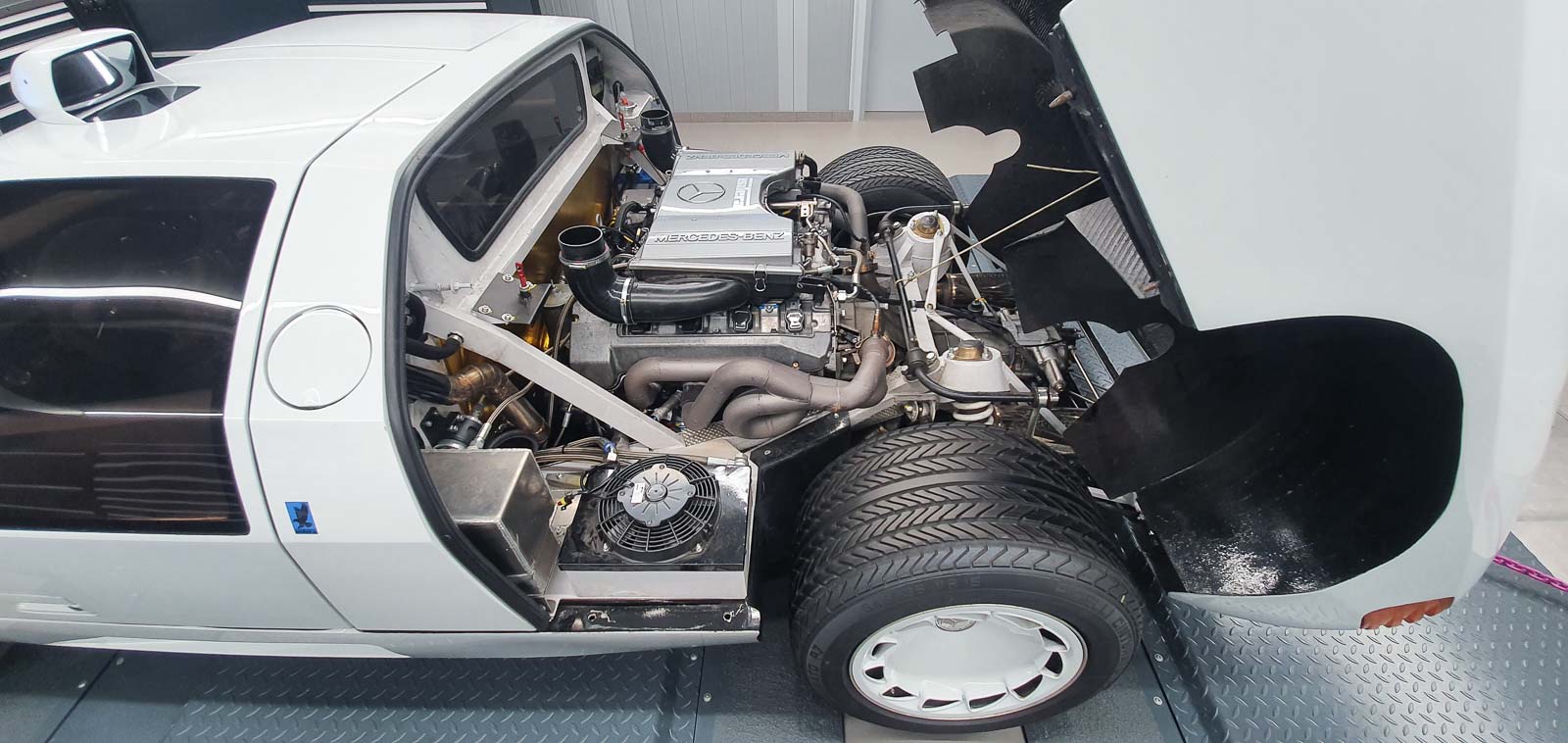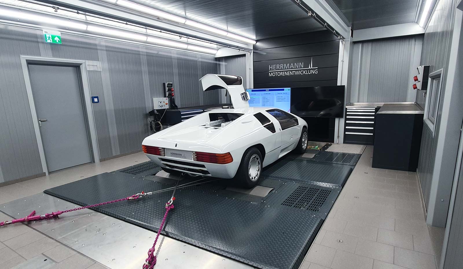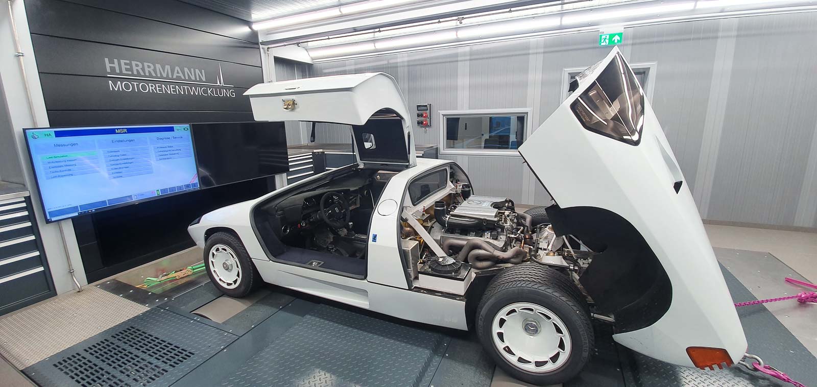 Nachdem wir im ersten Schritt den Motor, einen Mercedes-Benz M119 V8, auf dem Stationären Prüfstand abgestimmt hatten, erfolgte im Anschluss eine Überprüfung des Gesamtfahrzeuges auf dem Allrad-Scheitelrollen-Prüfstand.