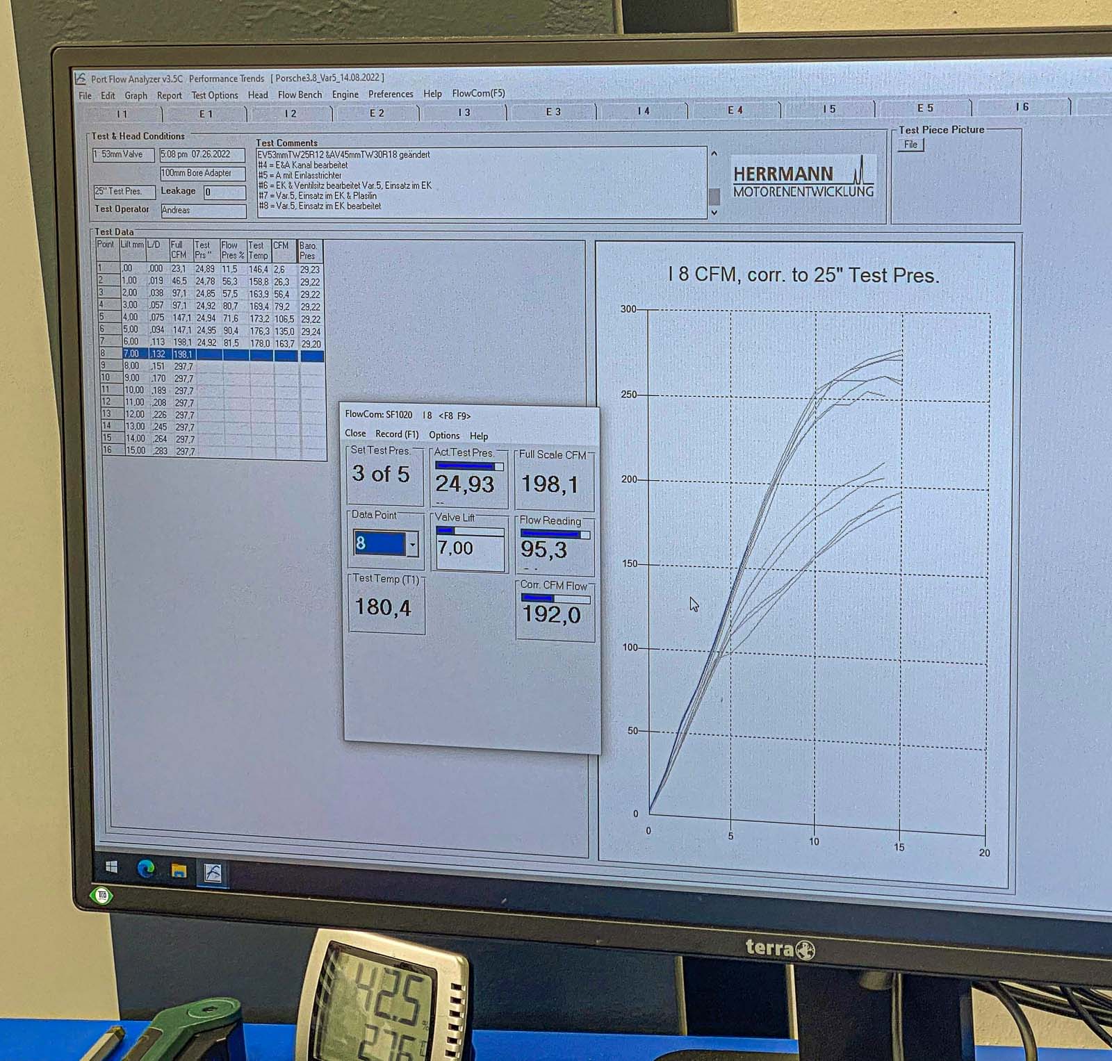 Dazu wurden die Ein- und Auslasskanäle von einem der sechs Zylinderköpfe mehrfach mechanisch bearbeitet und auf einer Flowbench getestet, bis der Luftmengenstrom über die gesamte Öffnung des Ventils ein Optimum erreicht hat. Die finale Bearbeitung wurde auf die anderen Zylinderköpfe übertragen.